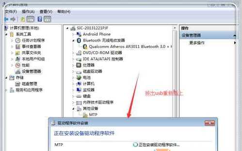 3、卸载后,拔掉手机,再重新插上,这时系统会自动安装驱动程序。如果不会安装 确保已经开启Win7为设备下载安装驱动程序软件。