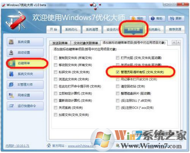 这里说的优化工具有很多种,一般支持WindowsVista的优化工具,都能用来优化WIndows7,比如Vista优化大师(进入下载),Vista总管(进入 下载)等,当然那些专门设计给Windows7的优化软件也可以达到一样的效果,比如Windows7优化大师(进入下载)、Windows7总管等等。这些工具中的系统设置中,右键设置都有 添加获得管理员权限的功能,这里就不详细说明了,大家自己找一下即可。