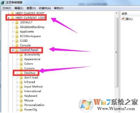 2、在注册表编辑器页面展开到“HKEY_CURRENT_USER/Control panel/Desktop”。