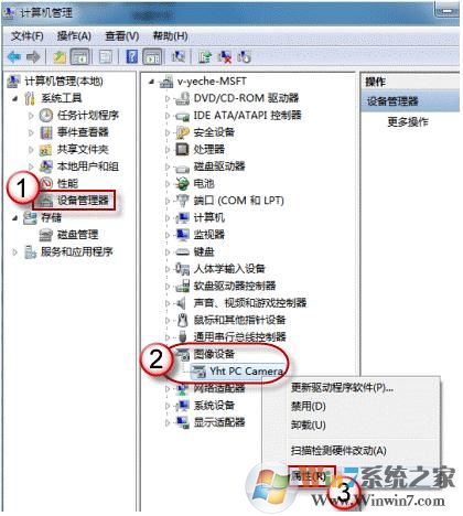 2、在“计算机管理”窗口左边一栏,双击“设备管理器”。然后,从右边栏中找到“图像设备”,点开。在摄像头设备上右键鼠标,选择“属性”。