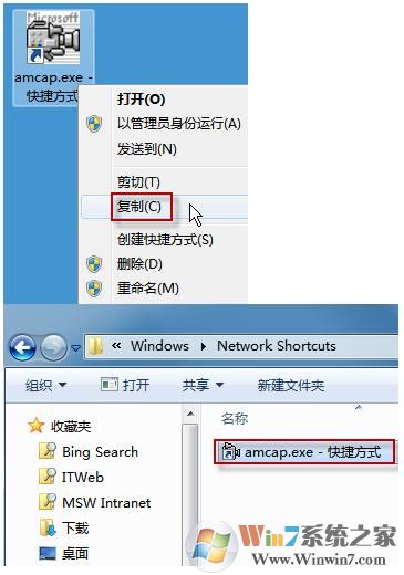 win7 没有摄像头预览软件,预览功能要借助第三方软件,在网上下载一个AMcap,大约300K,安装好后将AMcap快捷方式放到C:\用户\本机用户名 \Appdata\Roaming\Microsoft\Windows\Network shortcuts目录下,这样就可以在“我的电脑”中找到这个图标。