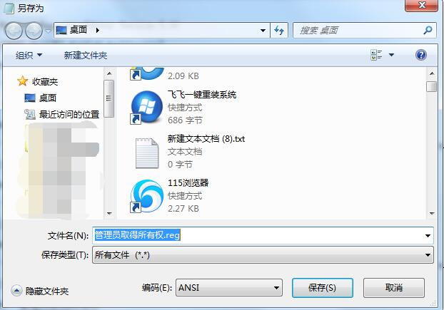 3、点记事本菜单——文件——另存为——选择“所有文件”然后命名为【管理员取得所有权.reg】;