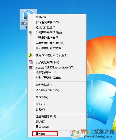 2、查看浏览器快捷方式,右击打开浏览器属性;