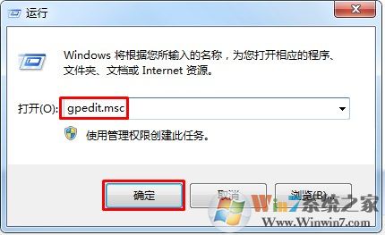 步骤一:在键盘上同时按下Win键+R键打开“运行”对话框,或者在Win7系统的“开始”菜单中点击”运行“,在运行对话框之中输入指令gpedit.msc后回车,打开win 7的组策略编辑器;