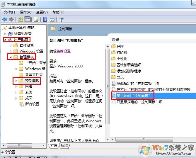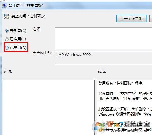 步骤四:如果“禁止访问控制面板”这个选项的状态是“开启”的话,那么控制面板就是因为这个而被禁用了,只要选择“关闭”之后,再返回win7系统的“开始”菜单,直接点击就可以打开了。