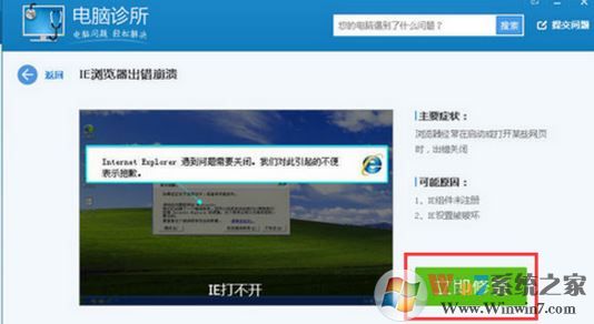 1、针对浏览器崩溃的问题,可以借助“电脑管家”所提供的“电脑诊所”工具进行修复操作。只需要在其中搜索“IE浏览器崩溃”并点击如图所示“立即修复”按钮尝试解决。