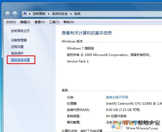2、在打开的界面中,点击左侧的“高级系统设置”,打开系统属性窗口;