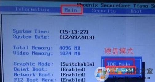 3、使用左右键移动到“main”,再用“↓键”移动到“SATA Mode:[AHCI Mode]”处,按回车键,就可以看到该主板支持两种模式,即“IDE Mode”和“AHCI Mode”类型,如图:
