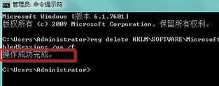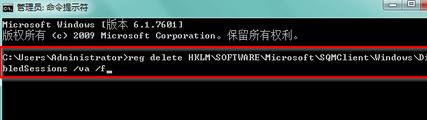 2、在命令提示符窗口中,输入以下命令:reg delete HKLM\SOFTWARE\Microsoft\SQMClient\Windows\DisabledSessions /va /f 按下键盘上的回车键执行命令;