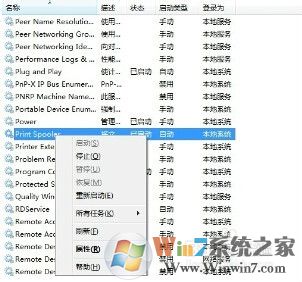 3、右键单击print spooler,点击重新启动即可。