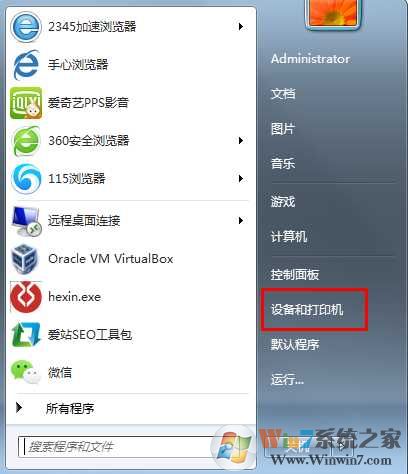 1、在开始菜单中打开打印机和设备;