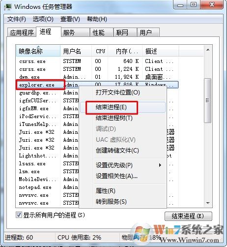 1、在win7系统环境下想要解决这个故障的话,快捷键Ctrl+Alt+Delete进入任务管理器界面,然后结束exploer.exe进程,结束以后删除exploer.exe服务;