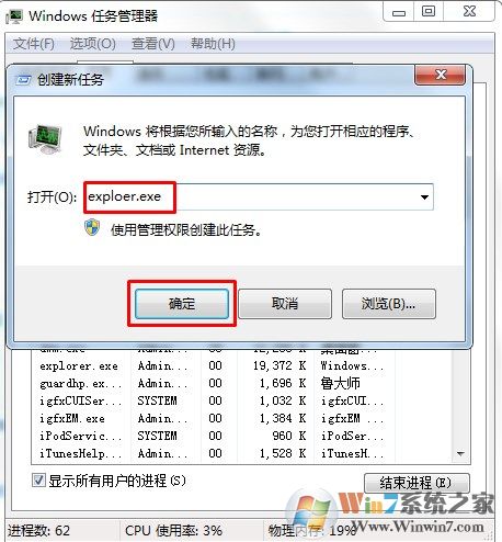 2、删除以后,为了确保win7系统可以稳定运行,还需要登录到win7操作系统界面,然后打开任务栏管理器重新创建一个exploer.exe服务即可。
