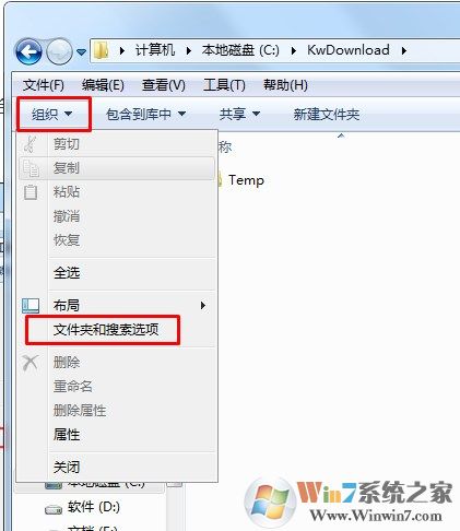 1、在桌面按下“WIN+E”组合键启动资源管理器,然后在弹出来的界面中点击左上角的“组织”选项,并且选择“文件夹与搜索选项”;