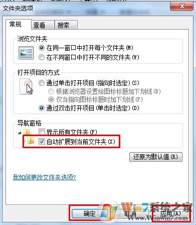 2、在弹出来的额文件夹选项界面中,在下方的导航窗格中,勾选“显示所有文件夹”和“自动扩展到当前文件夹”选项,然后点击确定即可。
