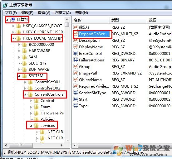 2在打开的注册表编辑器上,依次展开HKEY_LOCAL_MACHINE/SYSTEM/CurrentControlSet/Services/Audiosrv,然后在右侧窗格中找到DependOnService项目。