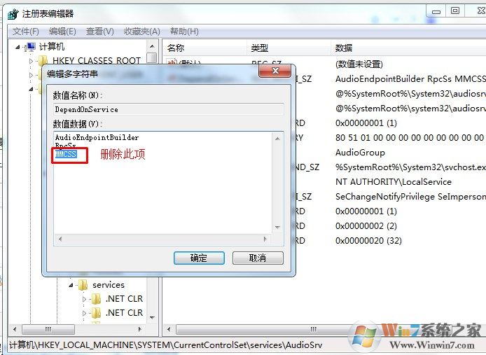 3、双击打开DependOnService键值,在打开的编辑窗口中删除MMCSS,保留其他数值,点击确定按钮退出注册表编辑器。