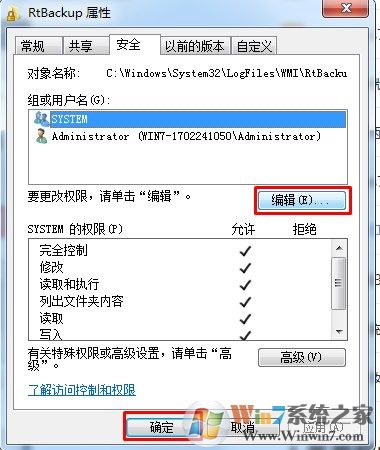 1、打开Win7系统,然后在打开C:\windows\system32\logfiles\wmi\RTbackup文件夹,右键单击选择“属性”。在RTbackup属性面板上,切换至“安全”选项卡中,在组或用户名下,点击“编辑”按钮。