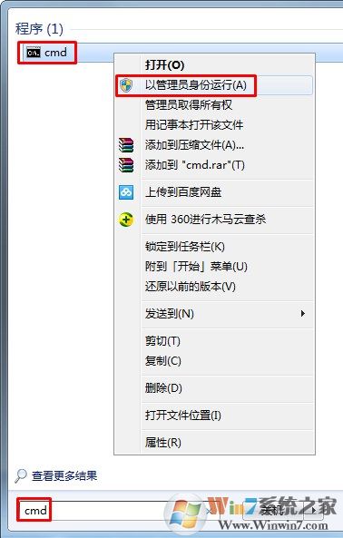 1、开始菜单搜索CMD这个程序,在这程序上面右键---以管理员方式运行。