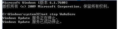 2、在运行后的cmd程序中输入:net stop WuAuServ,然后回车关闭服务。