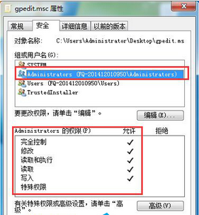 3、我们想剪切它的时候发现没有权限,点击右键属性——安全——高级——所有者——设置为你的管理员帐户,然后回到安全选项将你的管理员帐户设置为“完全控制”,应用之后我们就可以移动gpedit.msc了。