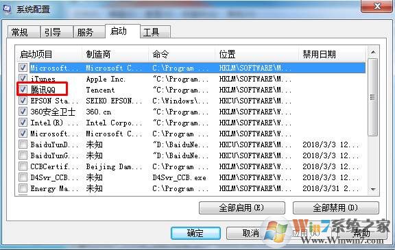 7、设置好确定,启动项就设置完成了,这时打开msconfig 管理启动项,我们可以看到新添加上的腾讯QQ