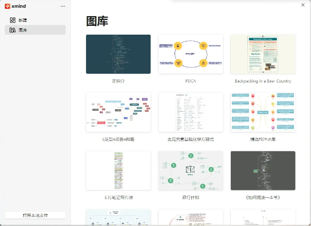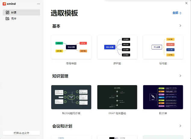 2. 主页控制面板:每次打开XMind,您都可以看到全新的主页控制面板,选择导图结构、主题风格,并打开最近的文件。