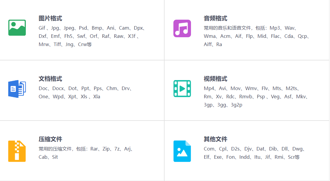 恢复文件类型:图片、视频、音频、文件夹、压缩包、文档...支持恢复多种文件格式。