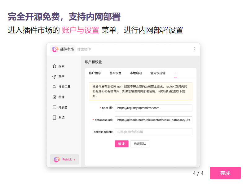所以 Rubick 解决了这个问题,Rubick 所有的插件是基于 npm 进行托管的,Rubick 提供了让你一键切换源的能力,这样就可以快速便捷的使用内网的插件包,你只需要将你的插件发布到公司 私有 npm 源上即可。