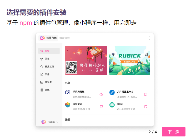 rubick 所有的插件是基于 npm 的管理方式,插件发布、安装更加简单、安全。uTools 则是需要走他们自己的发布审批流,需要收到打 upx 包。