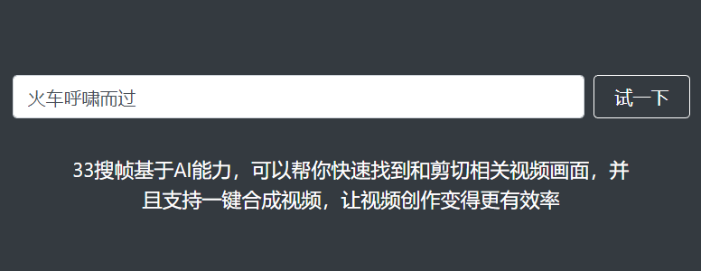在33搜帧的主界面中,你可以看到一个搜索框,这就是你搜索视频画面的地方。你只需要在搜索框中输入你想要的视频画面的描述,比如“火车呼啸而过”,“一个女孩在跳舞”等等,然后点击搜索按钮或者按回车键,就可以开始搜索了。