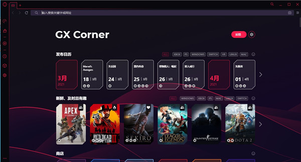 Opera GX浏览器是第一款专门面向游戏玩家的游戏专业浏览器。这款浏览器使用了Google的内核,保证了游戏的高速流畅。具有极简的界面风格,关注用户的使用方便。能够查看各种游戏的发布时间,设置CPU与网络加速。内置硬件加速,使浏览器能够充分合理使用计算机的硬件资源,画面渲染效果,增加用户游戏体验。