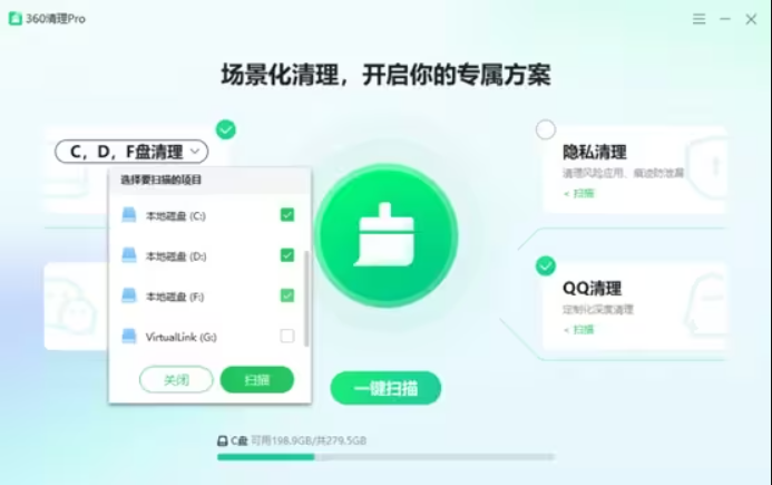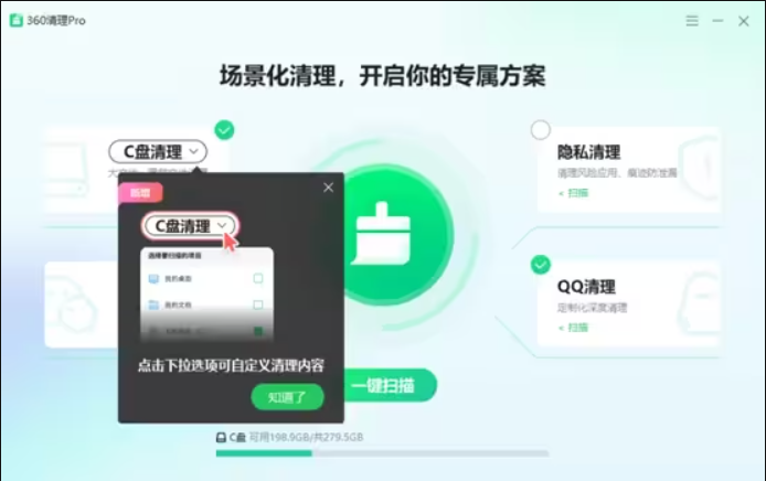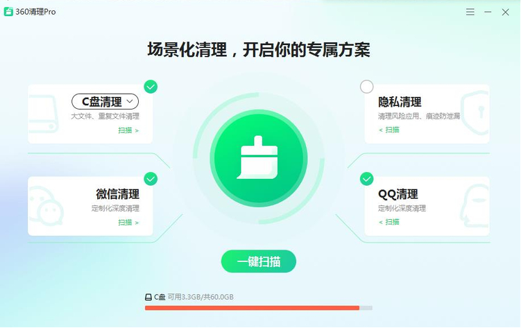 360清理PRO是一款基于用户使用场景化的全新清理工具,集成【C盘清理】、【微信清理】、【QQ清理】、【痕迹清理】四大场景,覆盖“大文件”、“重复文件”、“休眠文件”、“系统垃圾”、“微信图片视频”、“QQ图片视频”、“使用痕迹”等多种类型的垃圾清理,彻底为用户解决磁盘空间不足的问题,提升系统性能。