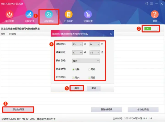 时间限制功能可以在指定时间段内禁止使用电脑或网络,只需打开“禁止在指定的时间段使用电脑或者网络”的开关,点击“添加时间段”按钮,在弹窗中设置开始时间、结束时间、具体日期、禁用项目和例外时间,点击“确定”即可。
