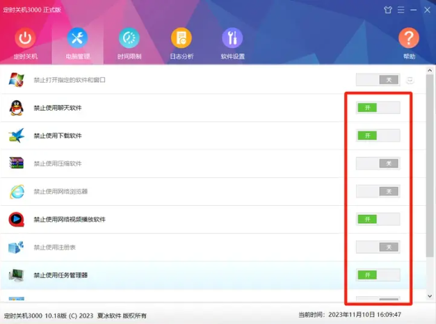 电脑管理功能可以禁止电脑运行某些类型的软件和系统工具,比如聊天软件、网络浏览器、任务管理器等等,只需打开对应设置后的开关即可。