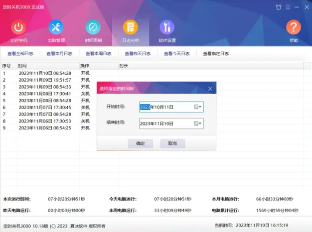使用方法:打开定时关机3000,点击软件窗口上方的“日志分析”,点击日志分析列表上方的按钮,可以查看全部日志、本月日志、本周日志、昨天日志、今天日志和指定日志。