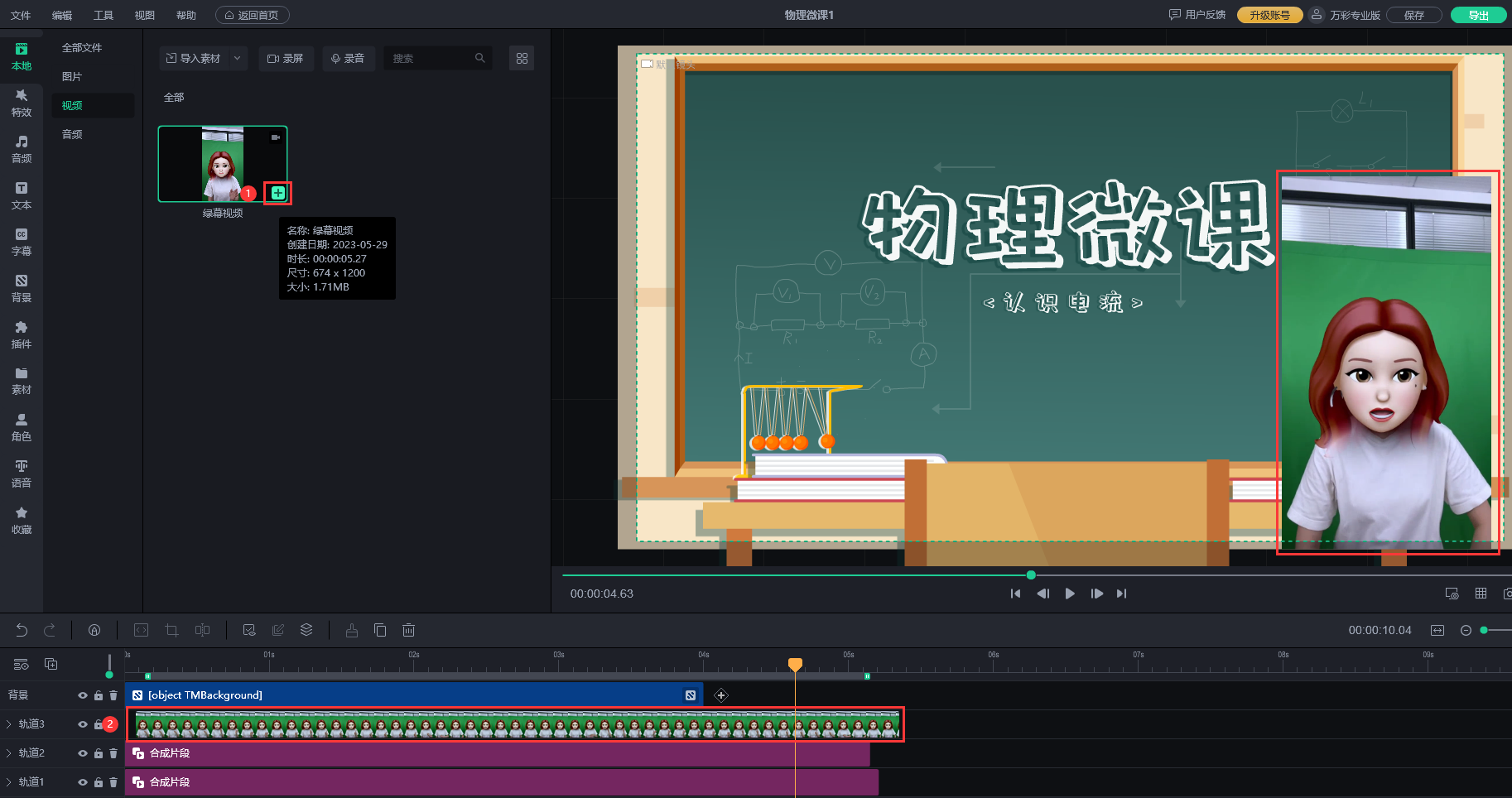 3)轨道上,点击选中视频,在属性 >> 抠像栏中,点击【智能抠像】开启按钮,一键开启智能抠像;