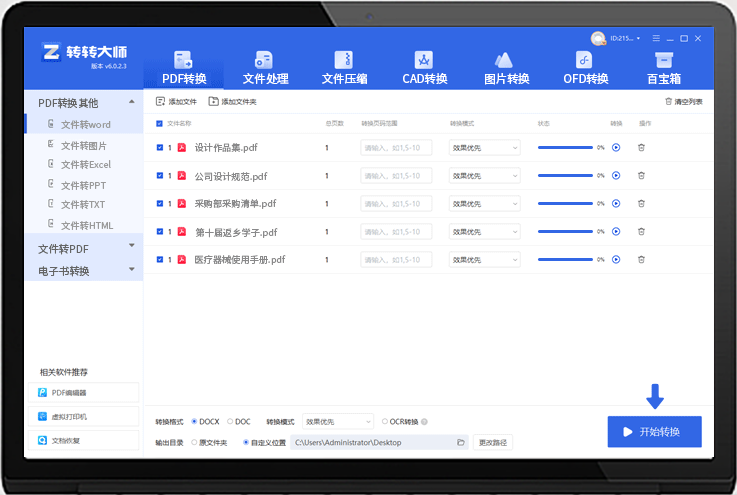 转转大师软件主要围绕PDF文件,图片文件,视频文件,数据恢复等办公常用场景格式转换,编辑,制作,压缩等实用功能中,为用户提供PDF转换,PDF处理,文件压缩,CAD转换,图片转换,gif制作,数据恢复等电子文档处理服务。该系列软件产品同时支持包括PDF、WORD、PPT、WPS 、EXCEL、CAD、TXT、HTML、图片、GIF、电子书等多种文件格式功能,大大提高了工作效率,是每一位白领不可或缺的办公软件之一。