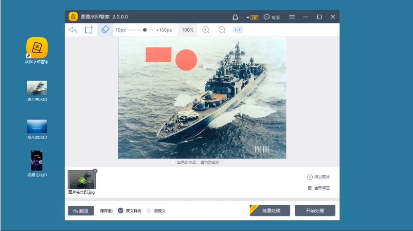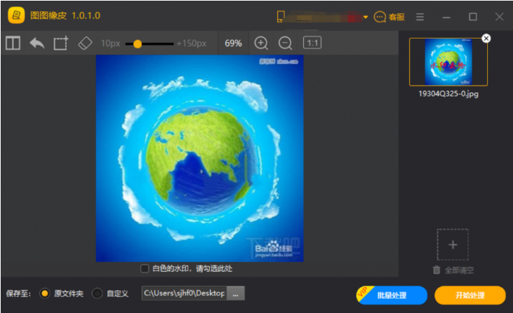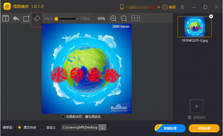 步骤二:选择工具“橡皮擦”,可根据操作需要调整橡皮擦大小和缩放图片。擦涂水印,点击“开始处理”。