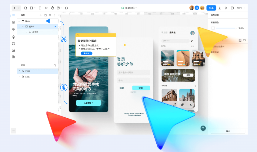 非常强大的原型设计工具,具有云保存、实时手机预览、各种手势、页面切换效果等功能!此外,墨刀可以快速创建页面连接,原始的拖动连接方式,使页面之间的连接关系清晰地显示出来。
