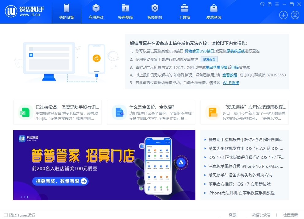 连接iOS设备到电脑上,并打开爱思助手PC端。