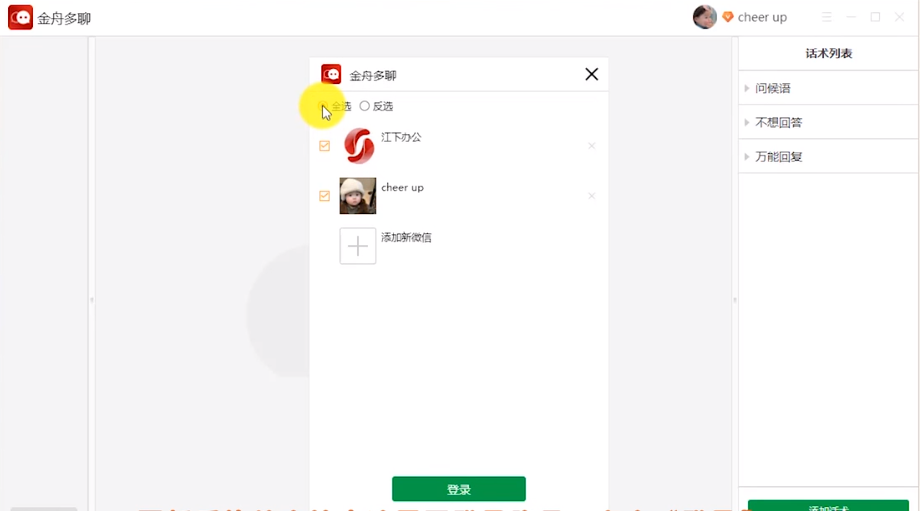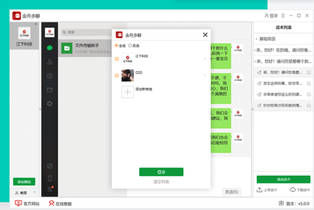 金舟多聊是一款专业的电脑微信多开辅助工具,能够在同一电脑上同时登陆多个微信账号。不限登录数量,一键批量登录多个账号,提高办公效率。软件还支持创建话术列表,云端上传/下载话术,信息同步更方便!聊天过程实时锁定聊天界面,防止聊天内容泄露,电脑办公更安全!
