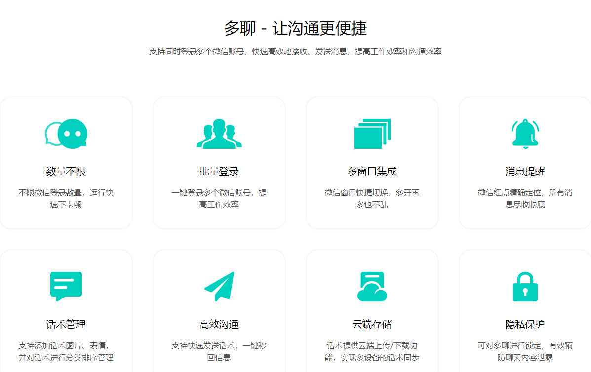 1、支持同时登录多个微信账号,登录的每个账号都能独立接收和发送消息,并保证聊天信息的安全;