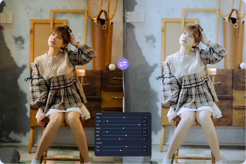 5、画面调色:视频画面颜色不喜欢,太亮或者太暗,轻松调节画面对比度、亮度、饱和度、色调,将调色内容保存为预设,下次直接套用。