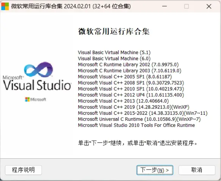 Microsoft Visual C++ Redistributable(简称MSVC,VB/VC,系统运行库)是Windows操作系统应用程序的基础类型库组件。此版Visual C++运行库组件合集(微软常用运行库合集)由国内封装爱好者@Dreamcast打包而成,整合Visual C ++组件安装包运行库所有版本,提供图形安装界面,可自选更新VC++版本。