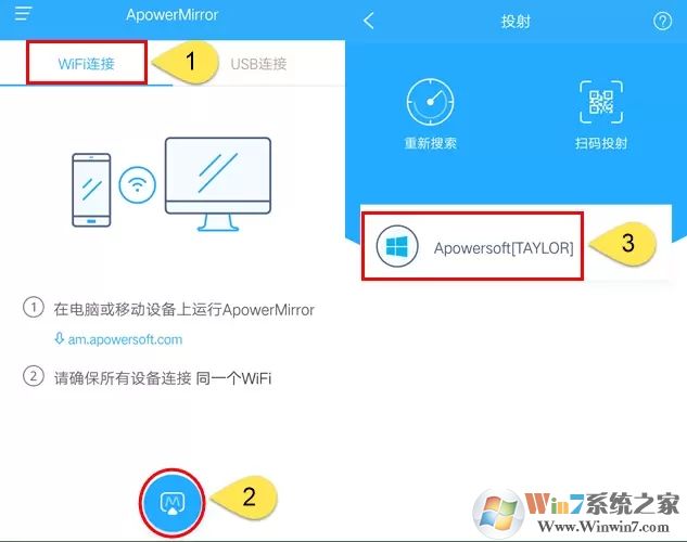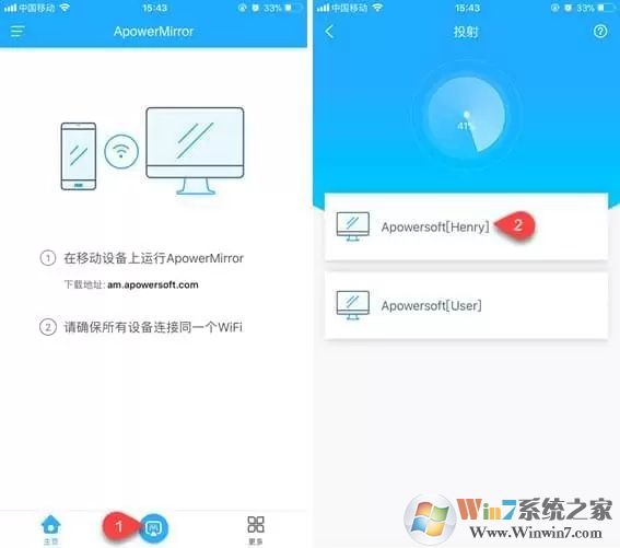 3、开启APP,点击投射图标,扫描可用的设备。选择“Apowersoft”的电脑设备,点击“立即开始”。