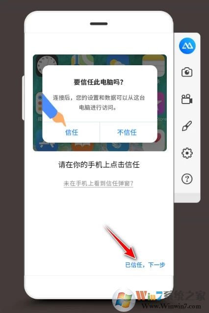 3、如果您是首次使用USB线连接电脑,在手机或平板上会出现一个“信任此电脑”的弹窗,点击“信任”后,在PC端傲软投屏上点击“已信任,下一步”;