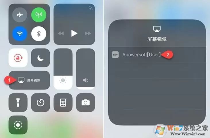 4、在iPhone主屏自下向上滑动,iOS 11系统的用户,点击“屏幕镜像”之后,选择“Apowersoft”名称设备;如果您是iOS 10系统及以上,点击“AirPlay镜像”后,选择“Apowersoft”选项。