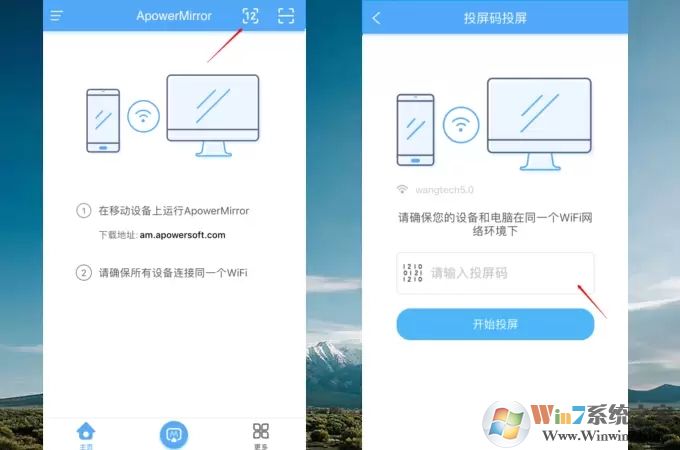 3、打开安卓手机或iPhone上的应用程序,点击右上角的【数字】按钮。在手机上输入电脑显示的投屏码。然后,你的手机就会成功投屏在电脑上了。