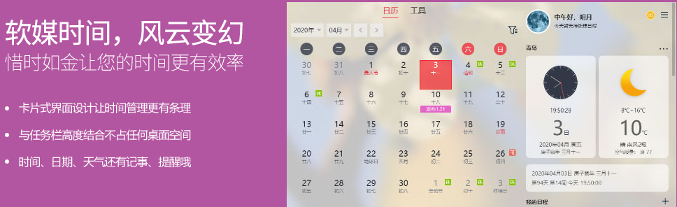 3、软媒时间:这款组件着实让人眼前一亮。开启该组件后,屏幕右下角的时间区域变宽,集中显示了时间日期、农历、星期和当前的温度。点开右下角区域,有关的日历、天气详情便呈现出来,设计非常精美。